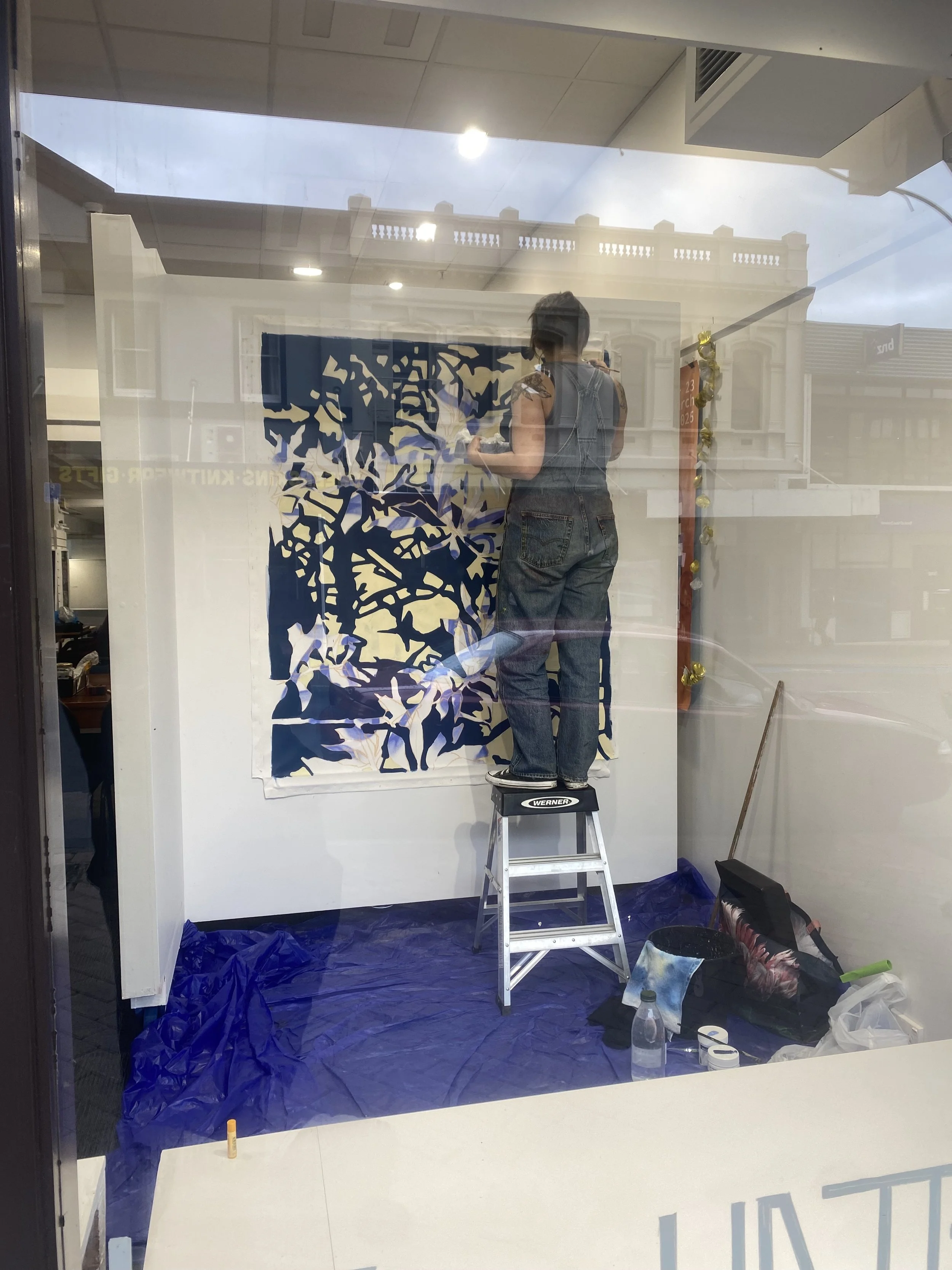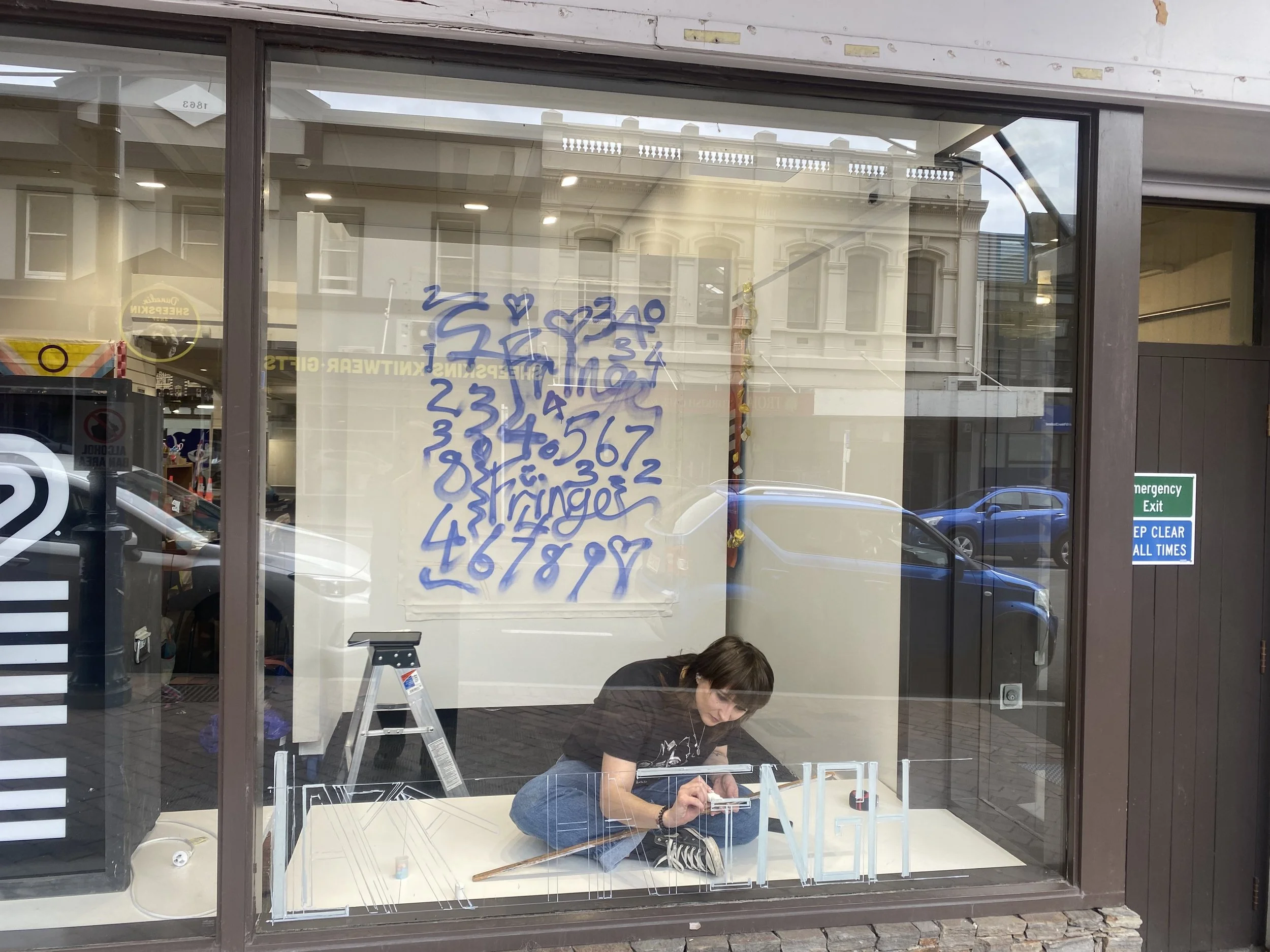 The heart of the project is interaction, interfacing with the public at every step of the creative process. The work developed from planning to final piece mostly during working hours within the White Box Gallery itself. Every phase evoked different responses from passersby, from vacant smoko stares, friendly pop-ins, enthusiastic thumbs up and window tapping to kids staring and pointing — perhaps wondering why I’m allowed to draw on windows and paint on walls.